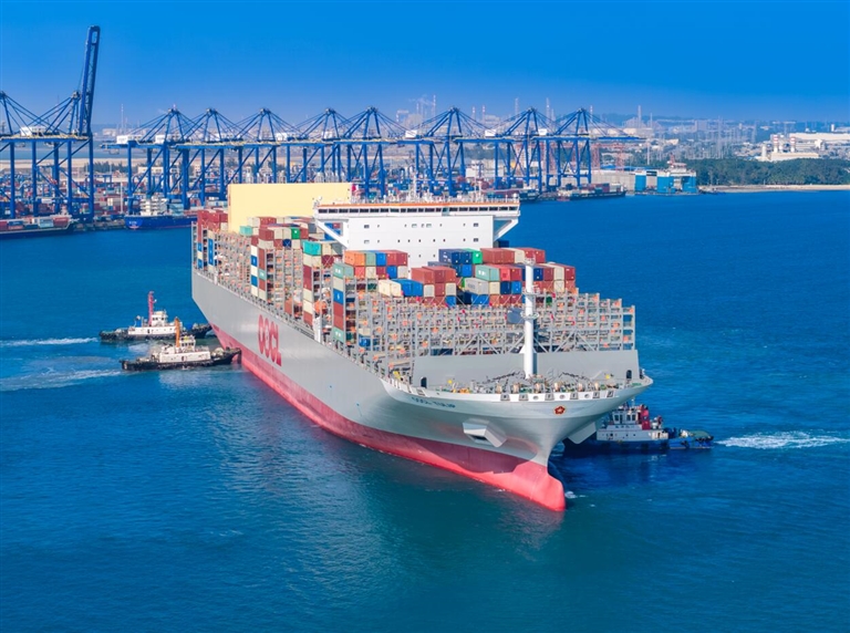 作为自贸港重要航运枢纽之一,洋浦国际集装箱码头船舶进出繁忙。这是总载重吨达16.5万、船长367米的美东线“东方郁金香”轮,它是目前靠泊该码头的最高等级集装箱船。邓晓龙 摄
